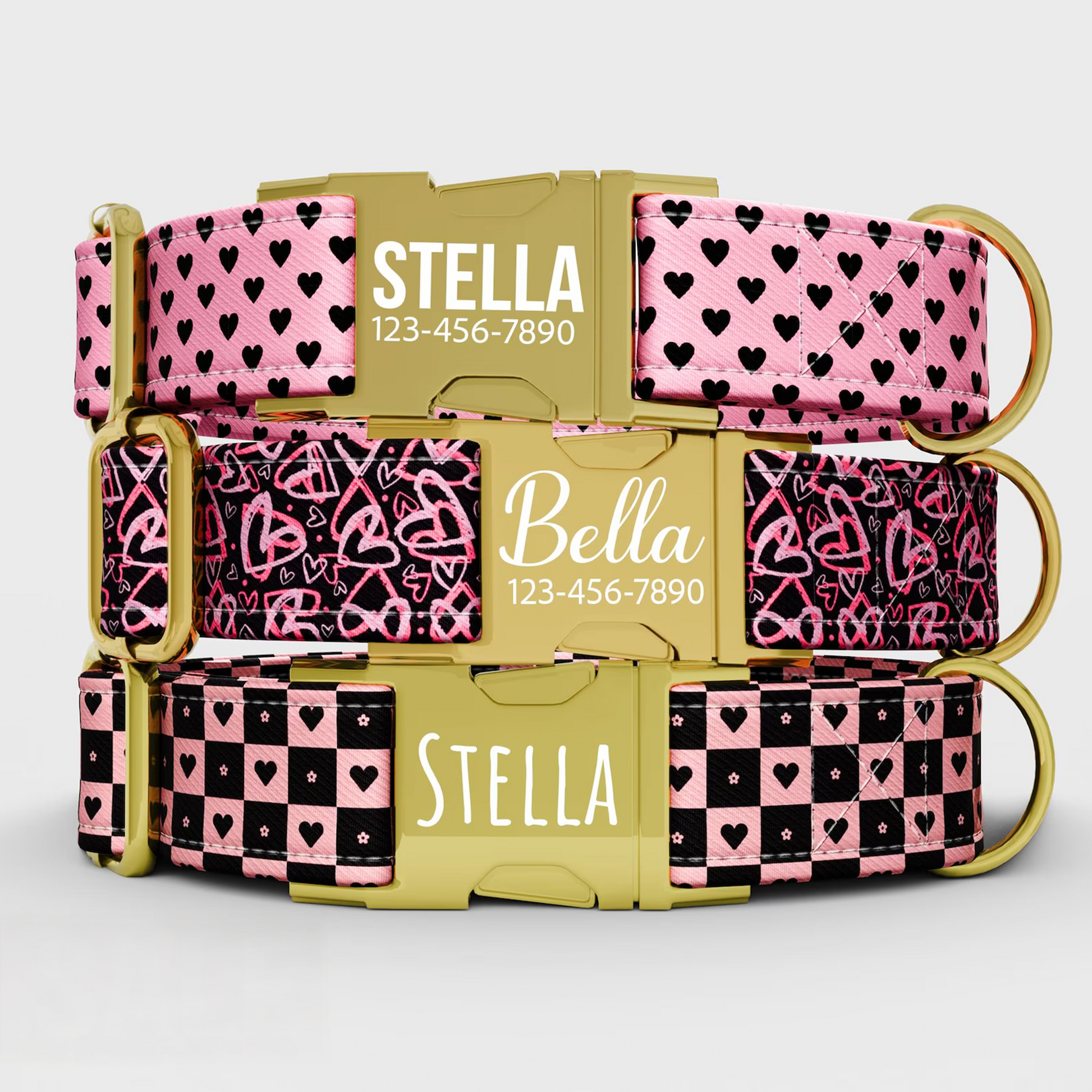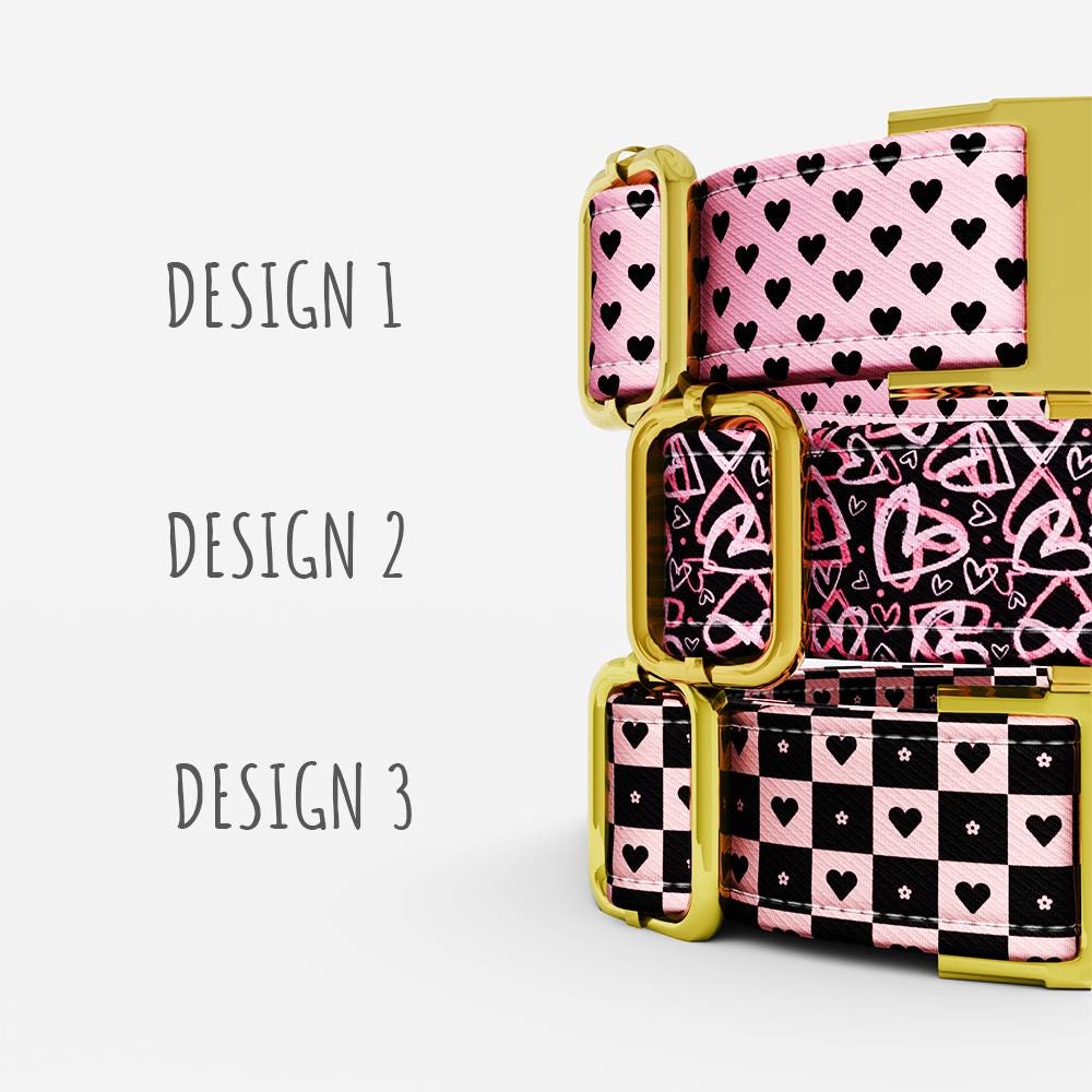 Personalized Pink & Black Hearts Dog Collar with Leash: Custom Valentine's Theme