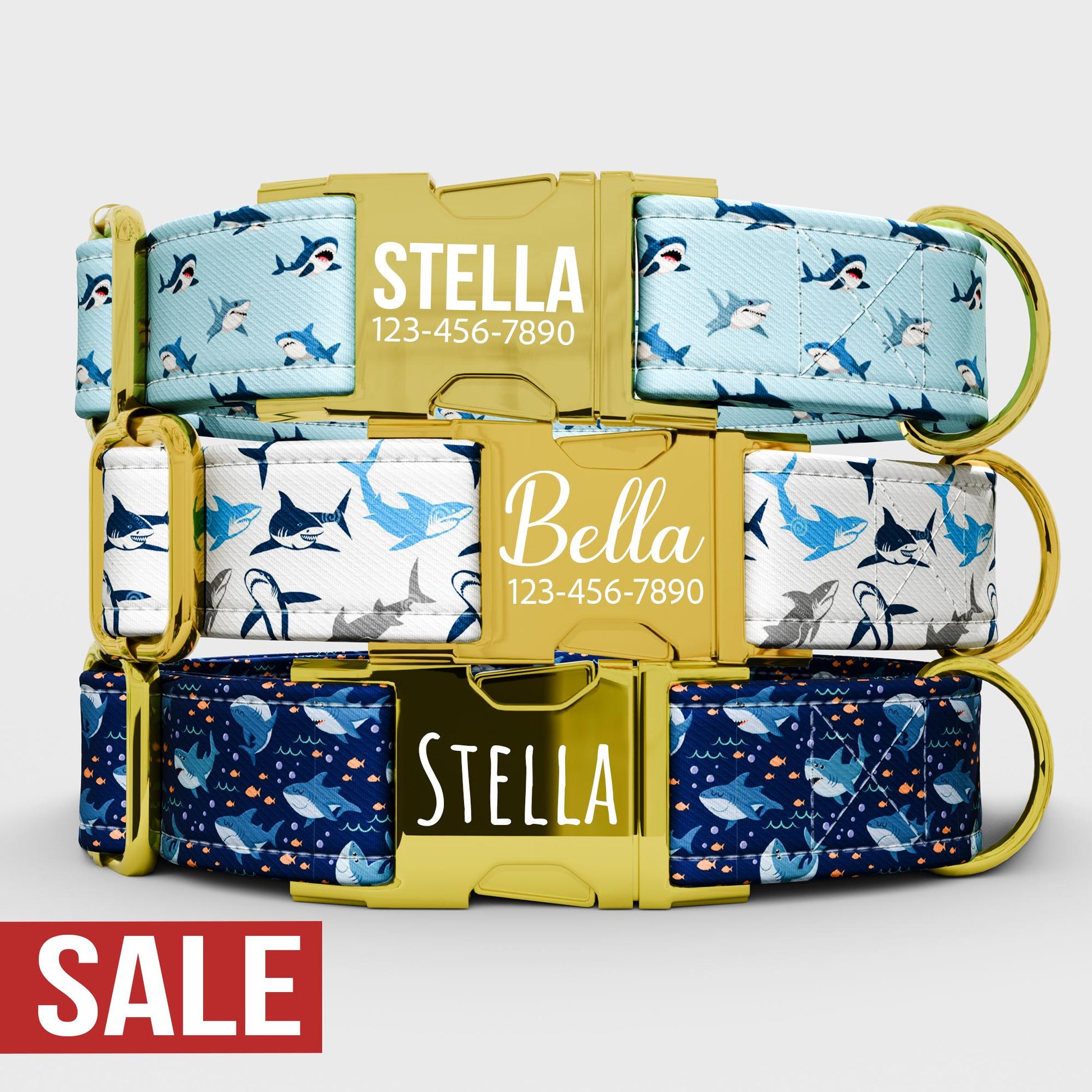 Personalized Shark Print Dog Collar with Leash: USA Handmade, Metal Buckle